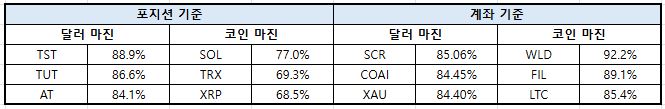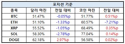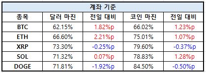 계좌 기준에서는 전반적으로 포지션 기준 대비 높은 마진 수준을 유지했다. BTC와 ETH가 달러 마진 기준 각각 1.82%p, 2.21%p 상승하며 회복세를 주도했고, SOL도 코인 마진 기준 1.28%p 오르며 선방했다. 다만 DOGE는 달러 마진 -1.92%p, 코인 마진 -0.50%p를 기록하며 계좌 기준에서도 약세 흐름을 피하지 못했다. XRP 역시 두 지표 모두 소폭 하락하며 부진한 모습을 보였다.