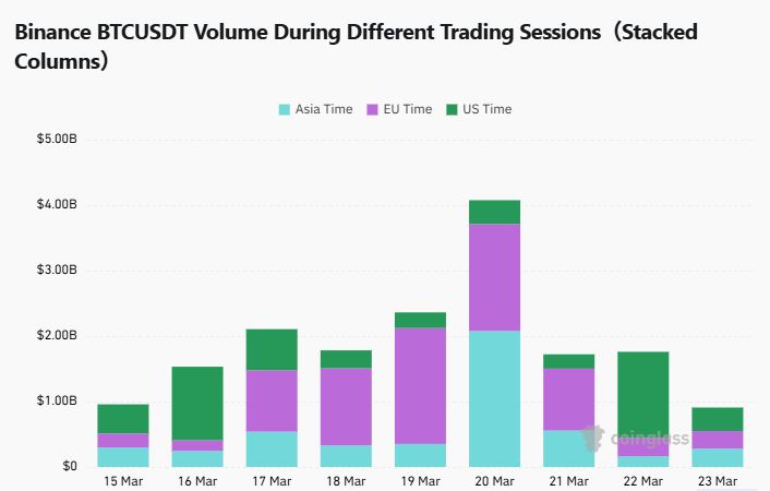 바이낸스 BTCUSDT 거래량은 아시아 시간대 2억7908만 달러, 유럽 시간대 2억7057만 달러, 미국 시간대 3억5863만 달러로 집계됐다.