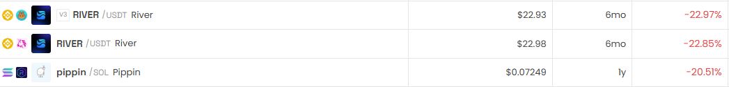 반면 가장 크게 하락한 거래쌍은 리버(RIVER/USDT)로 24시간 기준 -23%를 기록했다. 또 다른 리버(RIVER/USDT)는 -23%, 피핀(pippin/SOL)은 -21%로 약세 흐름을 보였다.