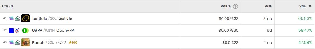 가장 크게 오른 거래쌍은 테스티클(testicle/SOL)로 24시간 기준 66% 상승했다. 이어 오픈브이피피(OVPP/WETH)는 58% 상승, 펀치(Punch/SOL)는 47% 상승했다.