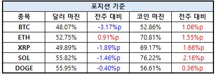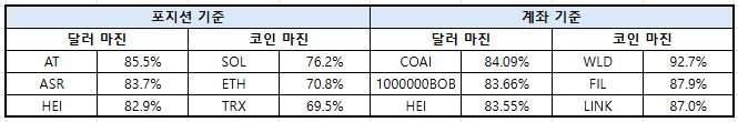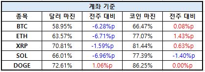 계좌 기준에서는 비트코인과 이더리움의 달러 마진이 각각 -6%대 하락을 기록하며 전반적인 리스크 축소 움직임이 두드러졌다. 반면 이더리움은 코인 마진이 +1.43%p 증가하며 상대적으로 공격적인 포지션이 유지된 모습이다.