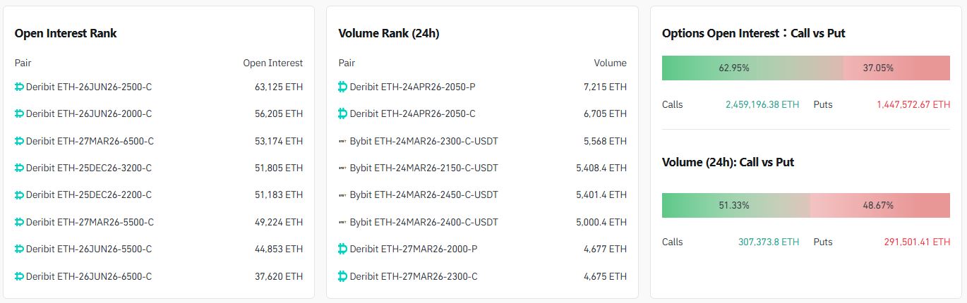 24시간 거래량 기준 상위 계약은 ▲2050달러 풋옵션(4월 24일·데리비트) ▲2050달러 콜옵션(4월 24일·데리비트) ▲2300달러 콜옵션(3월 24일·바이비트) 순으로 나타났다.