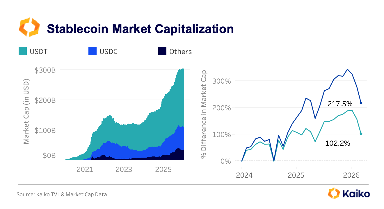 스테이블코인 시가총액은 2020년 500억 달러 미만에서 2026년 3000억 달러 이상으로 증가했으며 이 중 USDT는 약 1840억 달러, USDC는 약 790억 달러 규모를 차지하고 있다. 나머지 스테이블코인은 약 500억 달러 수준으로 시장 영향력이 제한적이다. 특히 2025년 말 이후 USDT 공급은 정체된 반면 USDC는 꾸준히 증가하며 점유율을 확대하는 흐름이 나타났다.