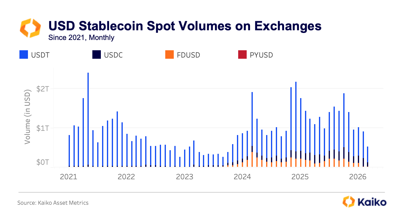 월간 거래량 기준으로도 이러한 구조 변화는 명확하게 나타났다. 스테이블코인 거래는 2021년 강세장에서 월 2조 달러 수준까지 증가한 뒤 2022년 약세장에서 5000억 달러 수준으로 감소했으나 이후 2024년 반등 국면에서 다시 1조5000억 달러 이상으로 회복됐다. 2026년 현재는 약 1조 달러 수준을 유지하며 거래 강도는 다소 둔화됐지만 구조적 채택은 유지되고 있다.