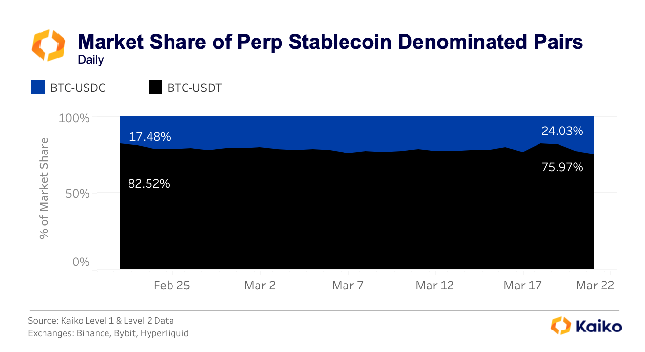 파생상품 시장에서는 두 스테이블코인이 공존하는 구조가 형성되고 있다. 2월 22일부터 3월 22일까지 일일 파생상품 거래량은 210억~250억 달러 범위에서 움직였으며 변동성 확대 시에는 300억 달러 수준까지 증가했다. 이 과정에서 USDT와 USDC는 비슷한 비율로 거래량이 확대되며 양쪽 모두에서 성숙한 유동성이 형성된 것으로 분석됐다.