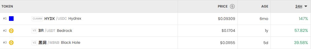 가장 크게 오른 거래쌍은 하이드렉스(HYDX/USDC)로 24시간 기준 147% 상승했다. 이어 베드록(BR/USDT)은 57.82% 상승, 블랙홀(Black Hole/WBNB)은 39.58% 상승했다.