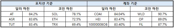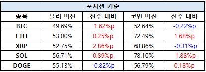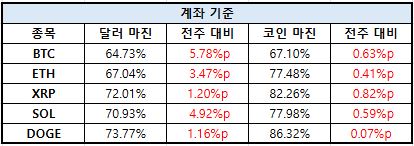 이더리움은 코인 마진 비중이 77.48%까지 확대되며 가장 높은 수준을 유지했고, 솔라나 역시 77.98%로 강한 상승 흐름을 이어갔다. 도지코인은 86.32%로 전체 자산 중 가장 높은 코인 마진 비중을 기록하며 극단적인 쏠림을 보였다.