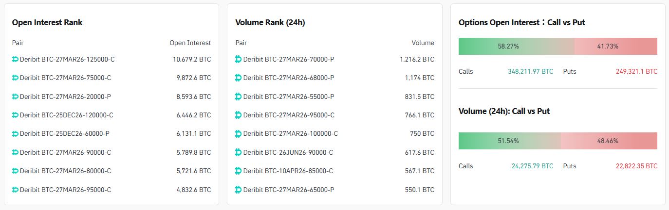 24시간 거래량 기준 상위 계약은 ▲7만 달러 풋옵션(3월 27일·데리비트) ▲6만8000달러 풋옵션(3월 27일·데리비트) ▲5만5000달러 풋옵션(3월 27일·데리비트) 순으로 나타났다.