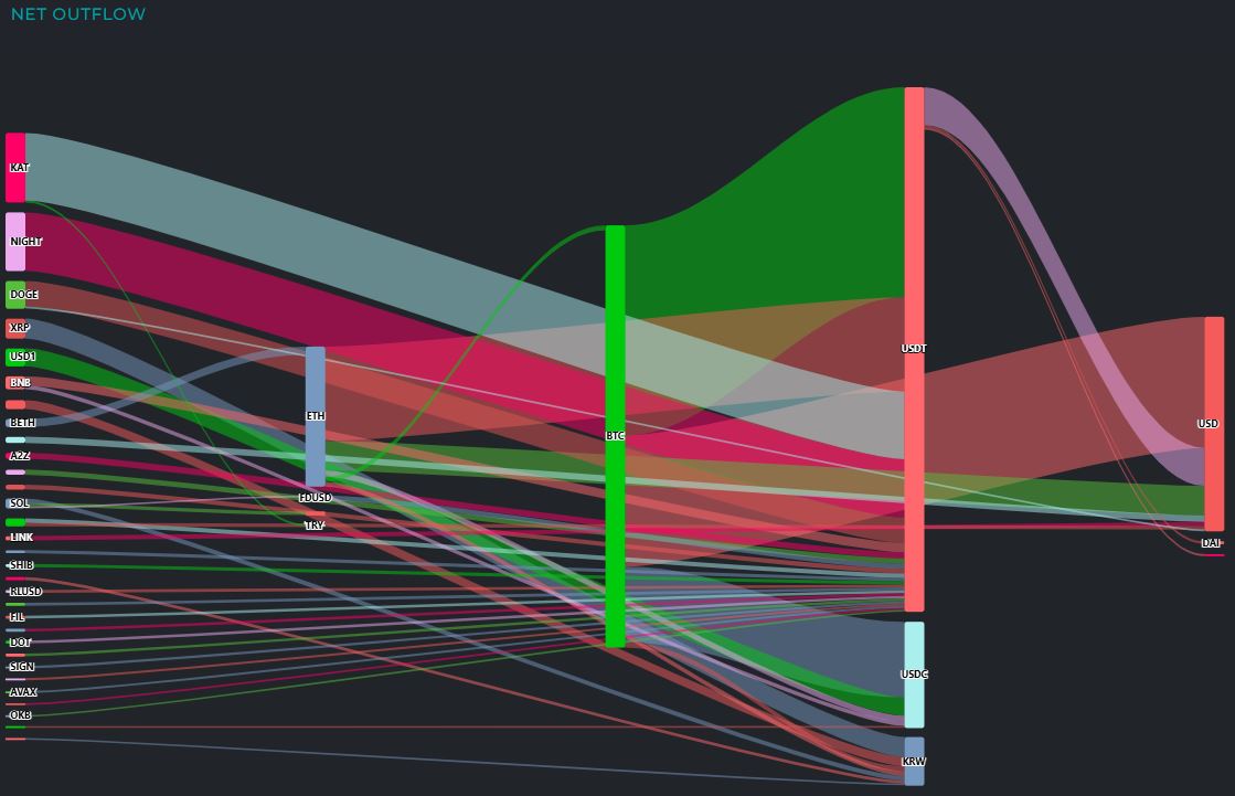 KAT에서 2100만 달러, NIGHT에서 1800만 달러가 유출됐으며 도지코인(DOGE)에서 830만 달러, XRP에서 600만 달러, USD1에서 550만 달러가 빠져 스테이블코인과 법정화폐로 이동했다.
