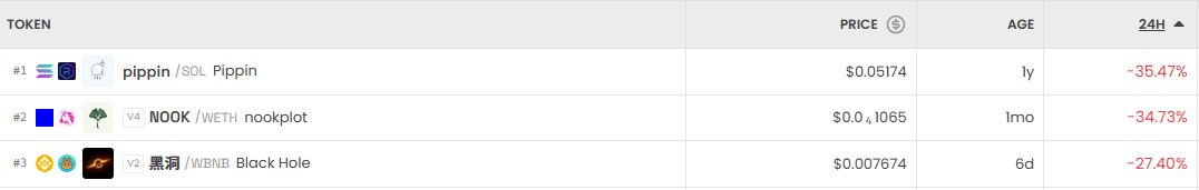 반면 가장 크게 하락한 거래쌍은 피핀(pippin/SOL)으로 24시간 기준 -35%를 기록했다. 이어 누크(NO0K/WETH)는 -34%, 블랙홀(Black Hole/WBNB)은 -27%로 약세 흐름을 보였다.
