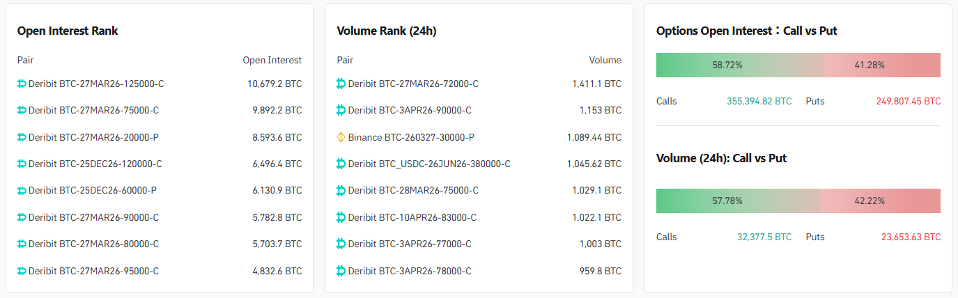24시간 거래량 기준 상위 계약은 ▲7만2000달러 콜옵션(3월 27일·데리비트) ▲9만 달러 콜옵션(4월 3일·데리비트) ▲3만 달러 풋옵션(3월 26일·바이낸스) 순으로 나타났다.