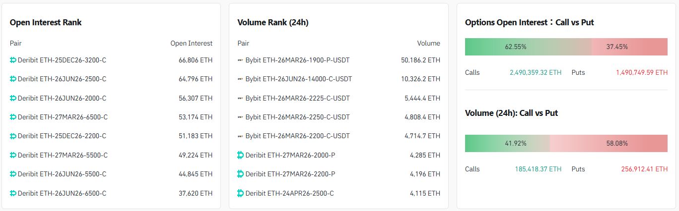 24시간 거래량 기준 상위 계약은 ▲1900달러 풋옵션(2026년 3월 26일·바이비트) ▲1만4000달러 콜옵션(2026년 6월 26일·바이비트) ▲2225달러 콜옵션(2026년 3월 26일·바이비트) 순으로 나타났다.