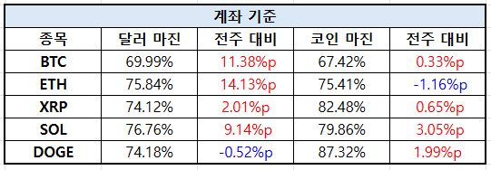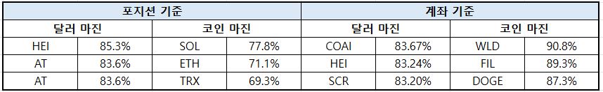 계좌 기준에서는 전반적으로 달러 마진 비중이 확대되며 투자자들의 위험 선호가 다시 높아진 흐름이 확인된다. BTC는 달러 마진 비중이 11.38%p 급증해 가장 뚜렷한 증가세를 보였고, ETH 역시 14.13%p 상승하며 강한 매수 전환이 나타났다. 반면 DOGE는 달러 마진 비중이 소폭 감소(-0.52%p)하며 일부 차익 실현 흐름이 포착됐다. 특히 SOL은 코인 마진 비중이 79.86%로 3.05%p 증가하며 고위험 레버리지 포지션 집중도가 높아진 모습이다.