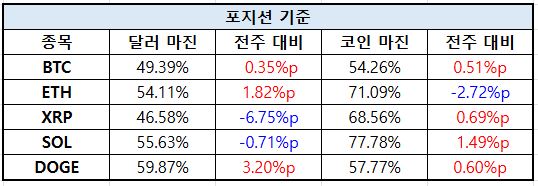 포지션 기준에서는 자산별 방향성이 엇갈리며 레버리지 포지셔닝이 재조정되는 흐름이 나타났다. BTC와 ETH는 달러 마진 비중이 각각 49.39%, 54.11%로 상승하며 매수 포지션이 일부 확대된 반면, XRP는 달러 마진 비중이 6.75%p 감소하며 상대적으로 매도 포지션이 강화됐다. 특히 SOL은 코인 마진 비중이 77.78%로 1.49%p 증가해 레버리지 롱 포지션 쏠림이 두드러졌고, DOGE 역시 달러 마진 비중이 3.20%p 확대되며 단기 매수 심리가 강화된 모습이다.