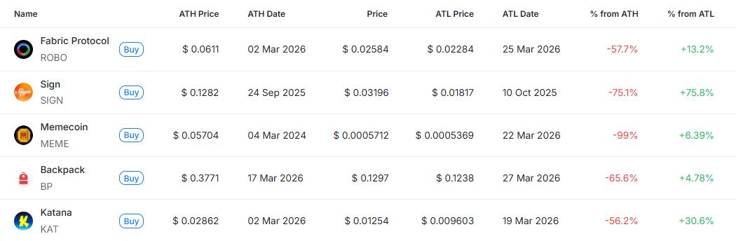 이 외에도 ▲백팩(BP) ▲AB(AB) ▲파워 프로토콜(POWER) ▲라바 네트워크(LAVA) ▲오디우스(AUDIO) ▲센티언트(SENT) ▲테오릭AI(THQ) ▲라이터(LIT) 전체 13개 종목이 신저점을 경신한 이후 가격이 소폭 반등하는 흐름을 보였다. 대부분 종목이 ATL 대비 상승 폭이 1% 내외에 머물며 반등 강도는 제한적인 수준이다. 백팩(BP, +4.78%)과 파워 프로토콜(POWER, +2.95%)은 상대적으로 반등 폭이 확대되며 단기 변동성이 두드러진 모습이다.