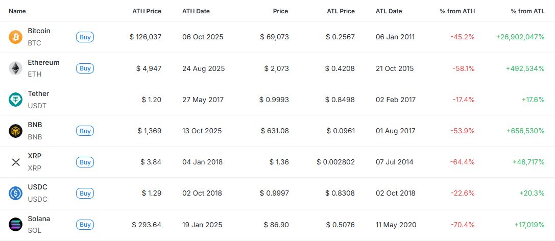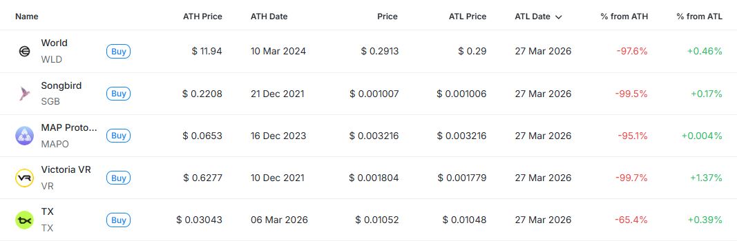 [편집자주] 암호화폐 시장은 하루 새 고점과 저점이 빠르게 바뀌는 고변동성 환경이다. 역대 최고가(ATH)와 역대 최저가(ATL) 경신 종목을 추적하면 강세와 약세 흐름을 조기에 포착할 수 있다. 크립토랭크 기준 시가총액 1000만 달러 이상 종목 중 하루 사이 고점 또는 저점을 경신한 주요 토큰을 정리하고 시가총액 상위 종목과 실시간 국내 인기 자산의 고점 대비 조정률을 함께 분석해 시장 회복 여력과 흐름을 진단한다.