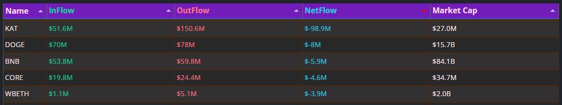 순유출 상위권에서는 카타나(KAT)가 약 9890만 달러 순유출을 기록하며 가장 큰 자금 이탈이 발생했다. 이어 도지코인(DOGE) 810만 달러, 바이낸스코인(BNB) 590만 달러, 코어(CORE) 460만 달러, 랩드 비콘 이더(WBETH) 390만 달러 순으로 자금 이탈이 이어졌다.