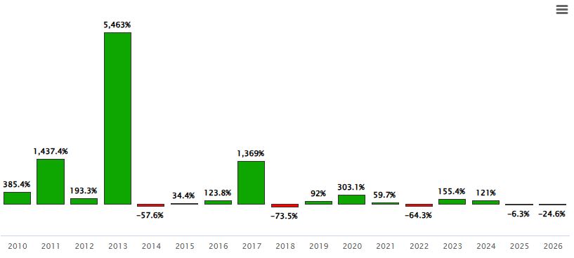 스탯뮤즈에 따르면 최근 연간 수익률은 ▲2022년 –64.3% ▲2023년 155.4% ▲2024년 121% ▲2025년 -6.3%로 집계됐다. 2026년 연초 대비 수익률은 -24.6%를 기록 중이다.
