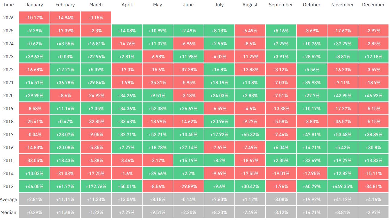 이달 들어 비트코인의 월간 수익률은 -0.15%를 기록 중이다. 이는 3월 평균 수익률 11.33%를 크게 하회하고, 중앙값 -1.22%는 소폭 상회하는 흐름이다. 3월은 과거 13번 중 7번 하락 마감한 달이다.