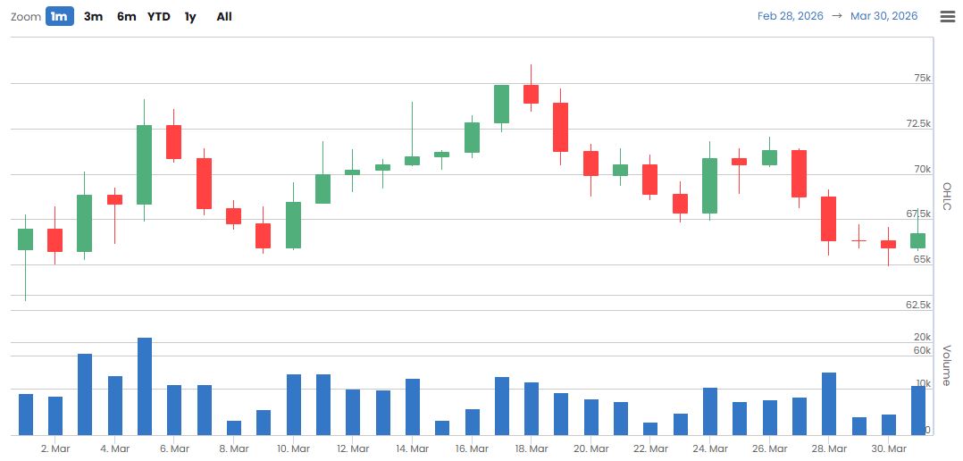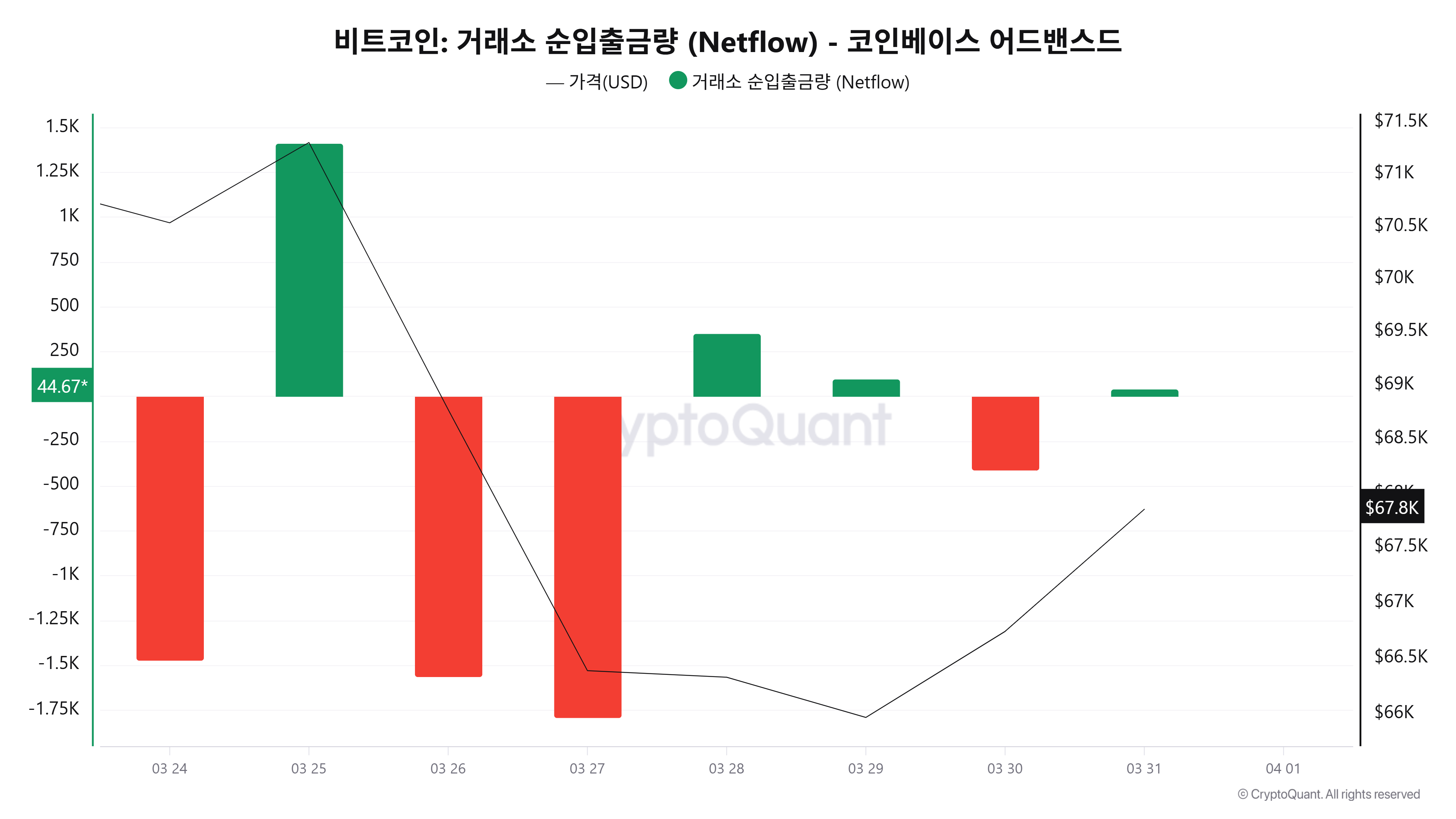 크립토퀀트 데이터에 따르면 3월 31일(UTC 기준, 미완결) 코인베이스 어드밴스드 기준 비트코인 순입출금은 +44BTC로 집계됐다. 코인베이스는 기관 비중이 높은 거래소로, 순유입은 통상 매수 또는 자산 유입으로 해석되는데 전일(-407BTC) 대비 흐름이 반전되며 기관 수급이 소폭 개선된 모습이다.