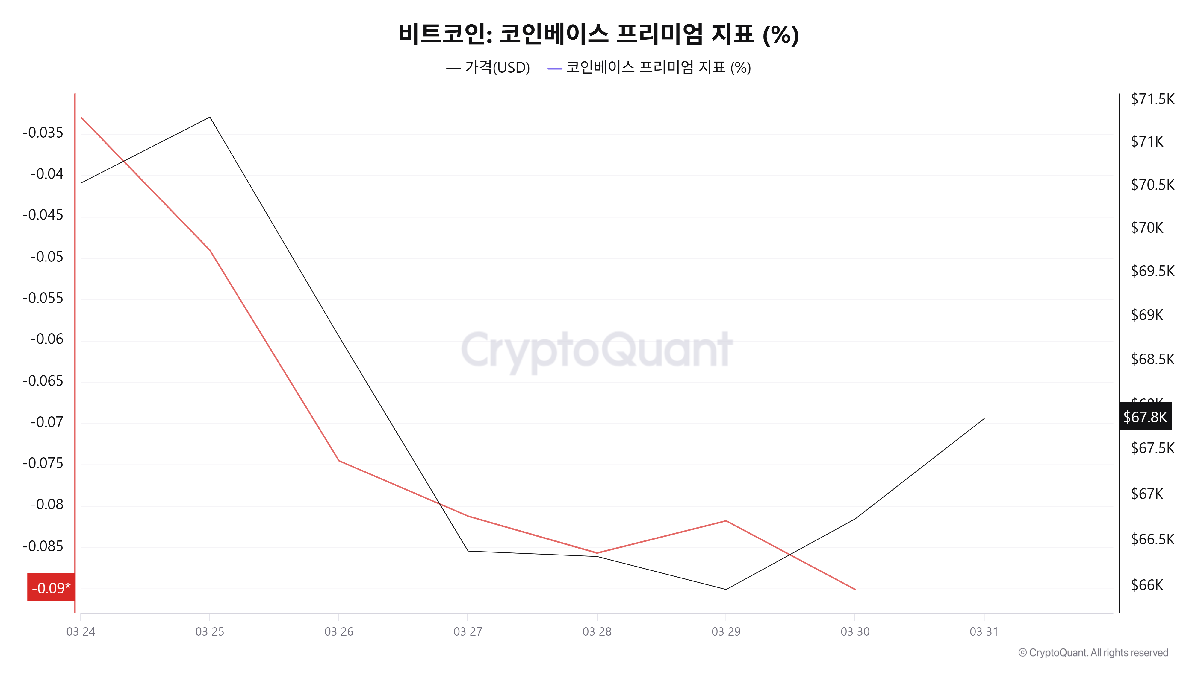 크립토퀀트 데이터에 따르면 3월 30일(UTC 기준) 코인베이스 프리미엄 지표는 -0.09%를 기록했다.