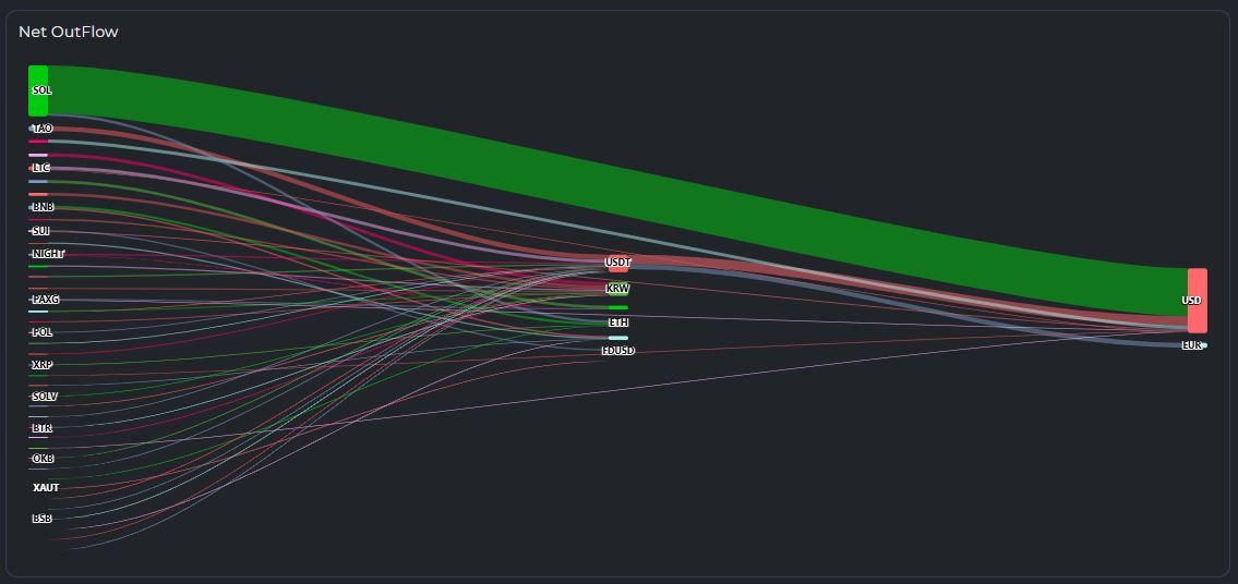 지난 5시간 자금 유출 흐름을 보면 솔라나(SOL)에서 827만 달러가 유출됐으며 이중 783만 달러가 달러로 흘러들었다. 이밖에 TAO, LTC, BNB, SUI 등 여러 코인에서도 분산된 매도 흐름이 나타났다.