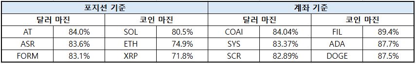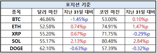 반면 리플(XRP)과 솔라나(SOL)는 달러 마진이 각각 3.29%p, 3.38%p 증가하고 코인 마진도 동반 상승하며 계좌 단위에서도 공격적인 포지션 확대 흐름이 두드러졌다.