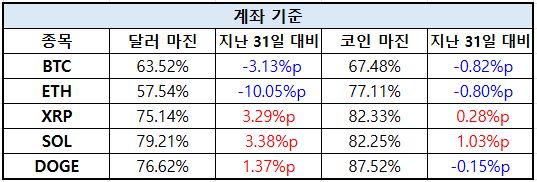비트코인(BTC)은 달러 마진이 63.52%로 3.13%p 감소하고 코인 마진도 0.82%p 줄어들며 계좌 단위에서도 레버리지 축소 흐름이 이어졌다.