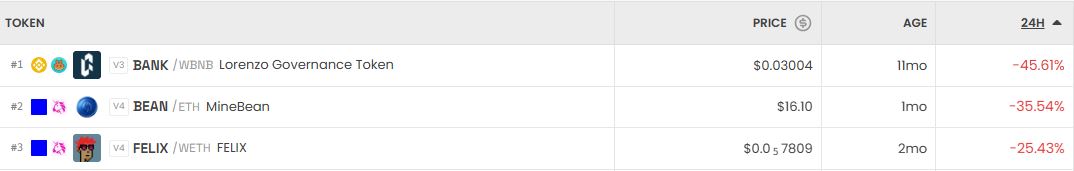반면 가장 크게 하락한 거래쌍은 BANK(BANK/WBNB)로 24시간 기준 -45.61%를 기록했다. 이어 BEAN(BEAN/ETH)은 -35.54%, FELIX(FELIX/WETH)은 -25.43%로 약세 흐름을 보였다.