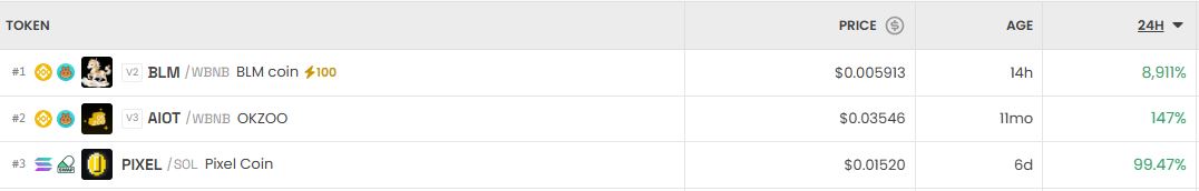 가장 크게 오른 거래쌍은 BLM(BLM/WBNB)로 24시간 기준 8,911% 상승했다. 이어 AIOT(AIOT/WBNB)은 147% 상승했으며, PIXEL(PIXEL/SOL)은 99.47% 상승했다.