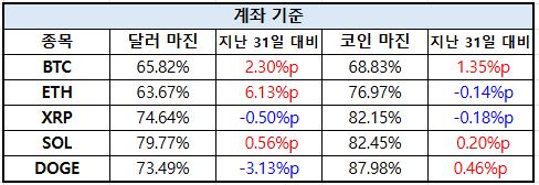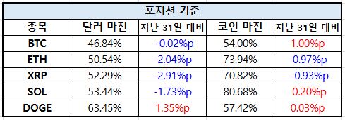 계좌 기준에서는 이더리움이 가장 뚜렷한 변화 흐름을 나타냈다. 달러 마진 비중이 6.13%p 급증하며 투자자들의 레버리지 활용이 빠르게 확대된 모습이다. 비트코인 역시 달러 마진과 코인 마진 비중이 각각 2.30%p, 1.35%p 상승하며 전반적인 포지션 확대 흐름이 나타났다. 반면 도지코인(DOGE)은 달러 마진 비중이 3.13%p 감소하며 일부 자산에서는 위험자산 선호가 약화되는 모습도 확인됐다.
