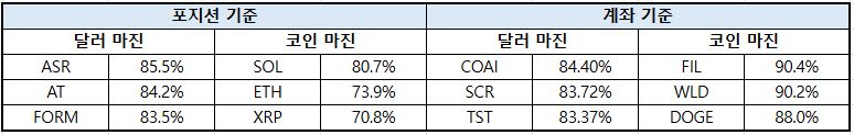 계좌 기준에서 이더리움 달러 마진 비중이 6.13%p 급증하며 레버리지 확대 흐름이 두드러졌다. 포지션 기준에서는 일부 자산의 달러 마진 축소와 코인 마진 유지가 동시에 나타나며 자산별 대응이 엇갈렸다.