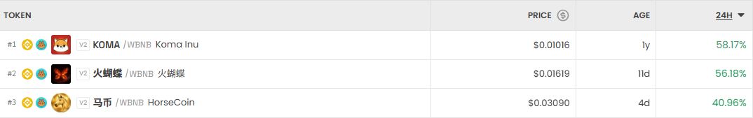 가장 크게 오른 거래쌍은 코마(KOMA/WBNB)로 24시간 기준 58.17% 상승했다. 이어 화호접(火蝴蝶/WBNB)은 56.18% 상승했으며, 호스코인(HorseCoin/WBNB)은 40.96% 상승했다.