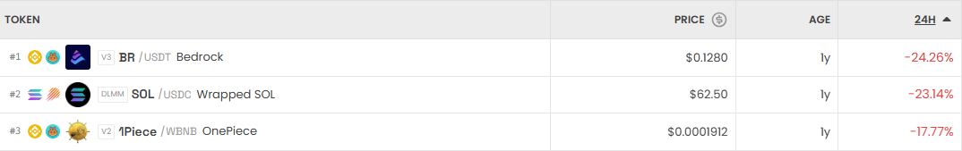 반면 가장 크게 하락한 거래쌍은 베드락(BR/USDT)으로 24시간 기준 -24.26%를 기록했다. 이어 래핑드 솔(Wrapped SOL/USDC)은 -23.14%, 원피스(OnePiece/WBNB)는 -17.77%로 약세 흐름을 보였다.