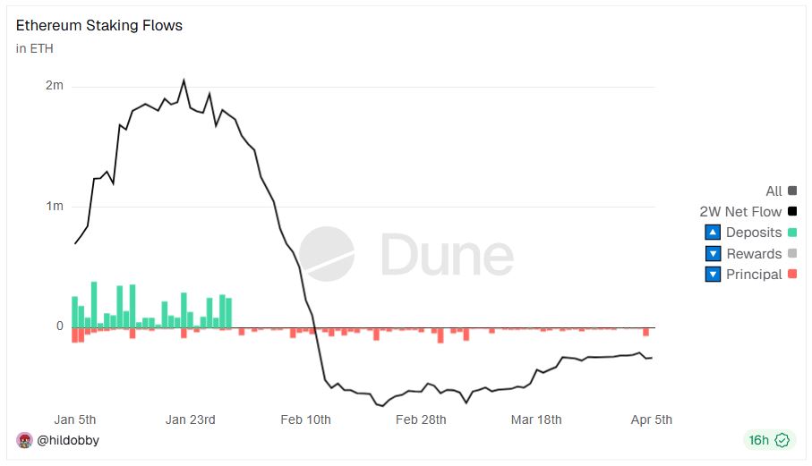 같은 기간 보상 출금은 총 1만4364 ETH, 원금 출금은 총 10만6946 ETH로 집계돼 출금 우위 흐름이 이어졌다. 4월 4일 6만5566 ETH가 출금되며 원금 출금이 집중됐다.