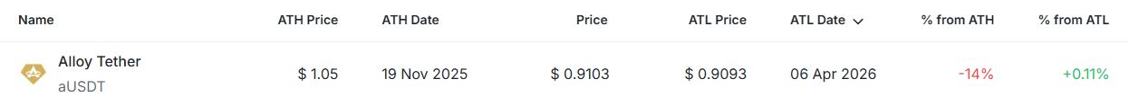 ① 알로이 테더(aUSDT) 현재가 0.9103달러 | ATL +0.11%