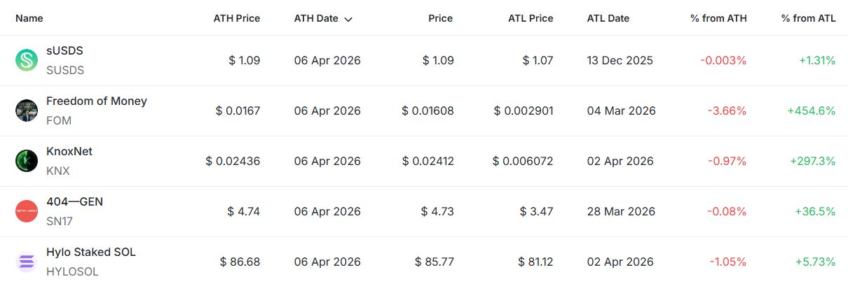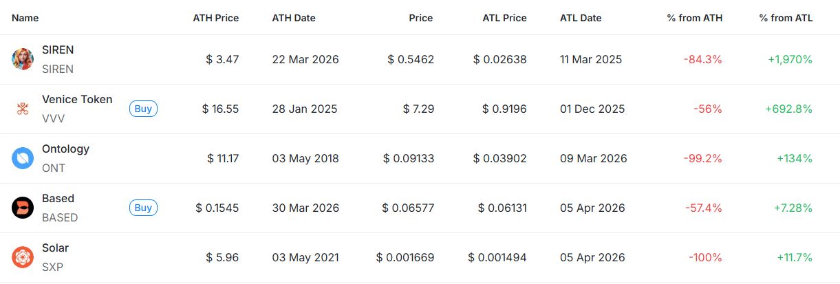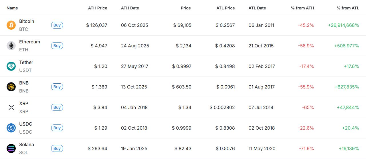 [편집자주] 암호화폐 시장은 하루 새 고점과 저점이 빠르게 바뀌는 고변동성 환경이다. 역대 최고가(ATH)와 역대 최저가(ATL) 경신 종목을 추적하면 강세와 약세 흐름을 조기에 포착할 수 있다. 크립토랭크 기준 시가총액 1000만 달러 이상 종목 중 하루 사이 고점 또는 저점을 경신한 주요 토큰을 정리하고 시가총액 상위 종목과 실시간 국내 인기 자산의 고점 대비 조정률을 함께 분석해 시장 회복 여력과 흐름을 진단한다.