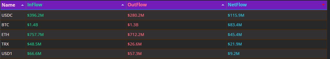 순유입 상위 종목은 USD코인(USDC)으로, 하루 1억1590만 달러의 순유입을 기록했다. 이어 비트코인(BTC) 8340만 달러, 이더리움(ETH) 4540만 달러, 트론(TRX) 2190만 달러, USD1 920만 달러 순으로 집계됐다.