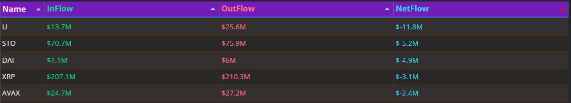 순유출 상위권에서는 U 토큰이 약 1180만 달러 순유출을 기록하며 가장 큰 자금 이탈이 발생했다. 이어 스테이크스톤(STO) 520만 달러, 다이(DAI) 490만 달러, XRP 310만 달러, 아발란체(AVAX) 240만 달러 순으로 자금 이탈이 이어졌다.
