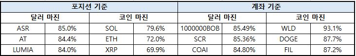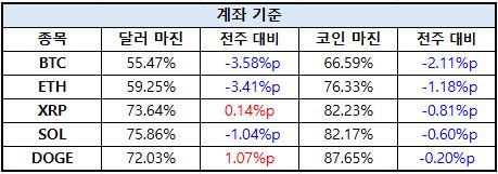 계좌 기준에서는 전반적으로 코인 마진 비중이 높은 구조가 지속되는 가운데 일부 자산에서 달러 마진 비중 조정이 나타났다. 비트코인(BTC)은 달러 마진 비중이 55.47%로 여전히 우위를 보였으나 전주 대비 3.58%p 감소하며 달러 기반 포지션이 줄었다.