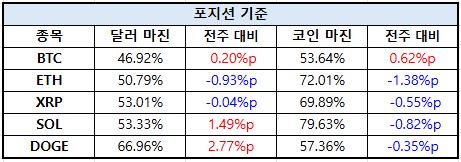 특히 XRP는 달러 마진 비중이 73.64%로 주요 자산 중 높은 수준을 유지하면서도 소폭 증가(+0.14%p)해 상대적으로 안정적인 달러 기반 포지션 흐름을 보였다. 반면 도지코인(DOGE)은 달러 마진 비중이 1.07%p 증가하며 72% 수준까지 확대돼 위험자산 선호 흐름이 일부 반영된 것으로 해석된다.