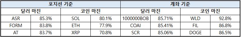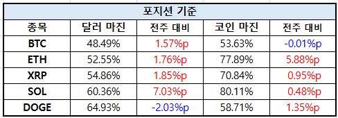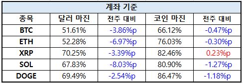 계좌 기준에서는 전반적으로 달러 마진 비중이 감소하며 보수적인 포지션 조정이 진행된 것으로 나타났다. 특히 이더리움은 달러 마진 비중이 약 7%p 가까이 줄어들며 주요 종목 중 가장 큰 감소폭을 기록했다. 이는 레버리지 축소 및 위험 회피 성향 강화로 해석된다. 반면 XRP(XRP)은 코인 마진 비중이 소폭 증가하며 상대적으로 안정적인 포지션 유지 흐름을 보였다.
