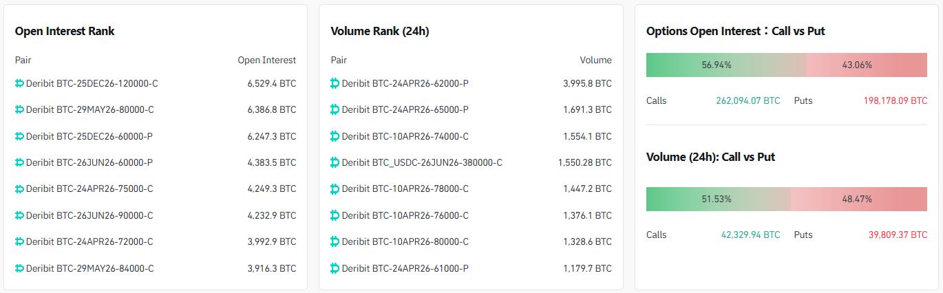 24시간 거래량 기준 상위 계약은 ▲6만2000달러 풋옵션(4월 24일·데리비트) ▲6만5000달러 풋옵션(4월 24일·데리비트) ▲7만4000달러 콜옵션(4월 10일·데리비트) 순으로 나타났다.
