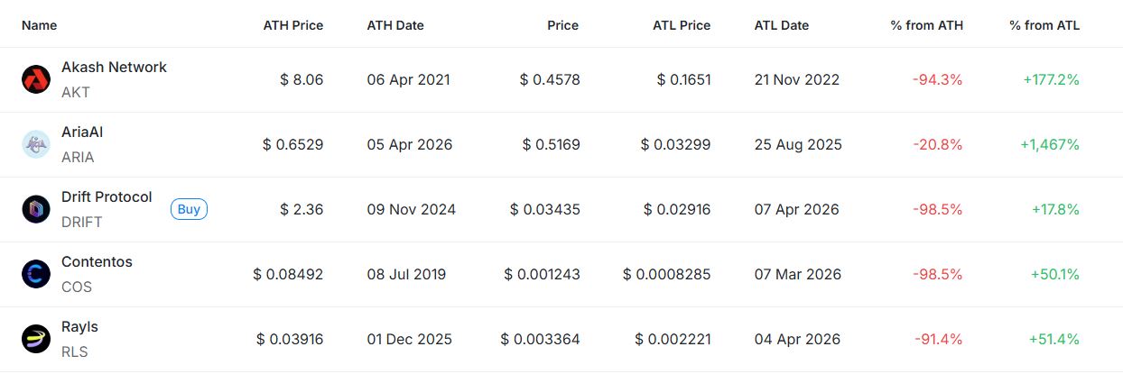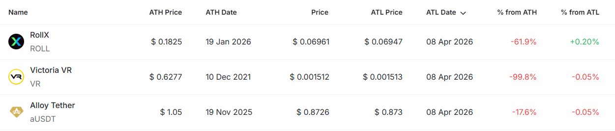 [편집자주] 암호화폐 시장은 하루 새 고점과 저점이 빠르게 바뀌는 고변동성 환경이다. 역대 최고가(ATH)와 역대 최저가(ATL) 경신 종목을 추적하면 강세와 약세 흐름을 조기에 포착할 수 있다. 크립토랭크 기준 시가총액 1000만 달러 이상 종목 중 하루 사이 고점 또는 저점을 경신한 주요 토큰을 정리하고 시가총액 상위 종목과 실시간 국내 인기 자산의 고점 대비 조정률을 함께 분석해 시장 회복 여력과 흐름을 진단한다.