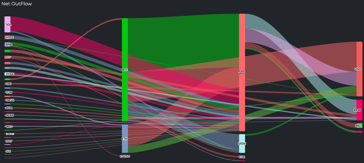 XRP, BNB 등으로 얕은 유입 흐름이 이어지는 가운데 BTC를 중심으로 자금 유출이 발생하고 있다.