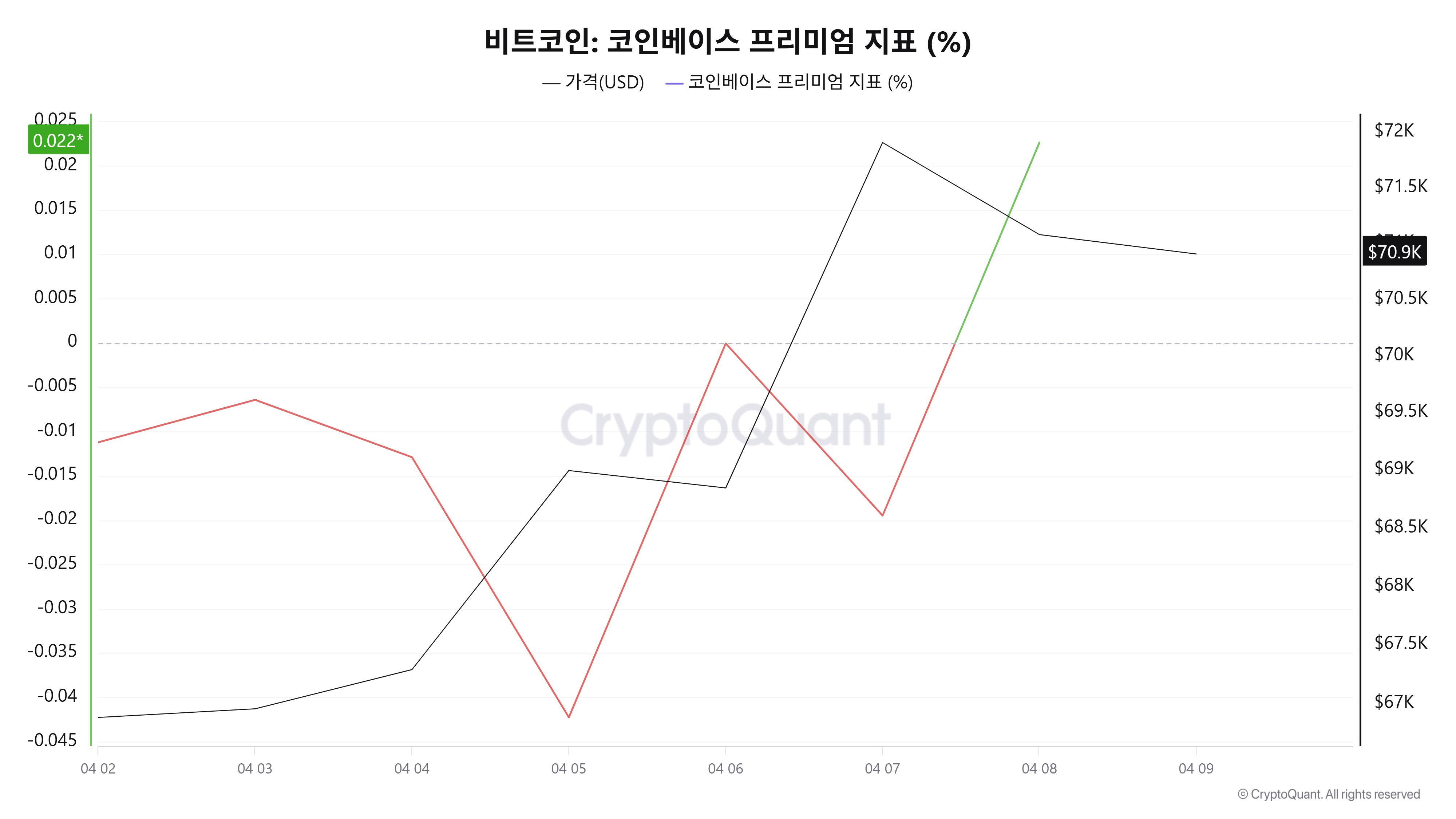 앞서 4월 4일 -0.0129%, 5일 -0.04426%, 6일 -0.00007%, 7일 -0.01949%를 기록한 데 이어 4월 8일 0.00259%로 플러스 전환되며 디스카운트 구간에서 벗어난 모습이다. 최근 흐름은 미국 거래소 가격이 글로벌 대비 프리미엄으로 전환되며 매수 우위 신호가 일부 나타나고 있음을 시사한다.