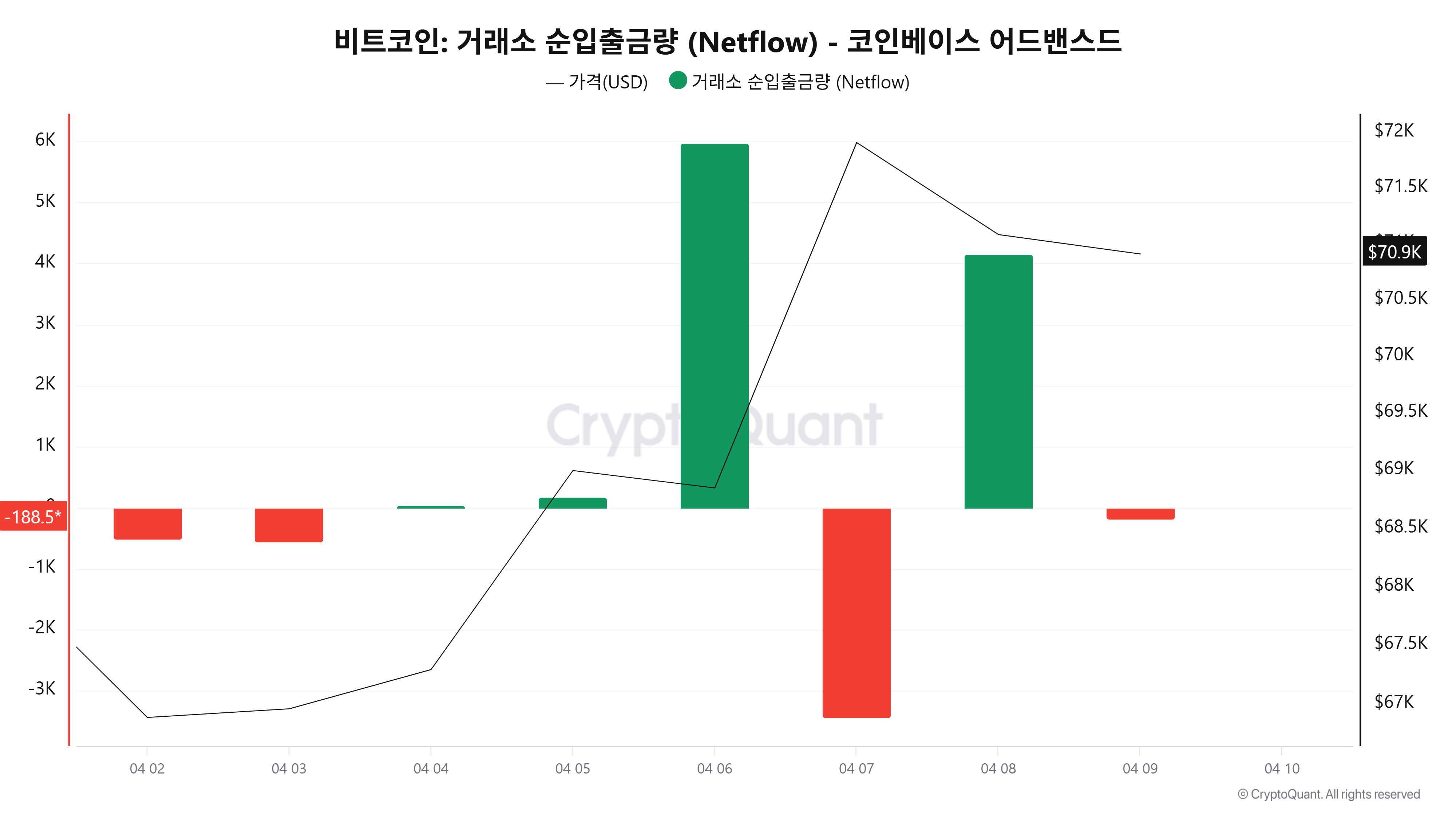 크립토퀀트 데이터에 따르면 4월 9일(UTC 기준, 미완결) 코인베이스 어드밴스드 기준 비트코인 순입출금은 -188BTC로 집계됐다. 코인베이스는 기관 비중이 높은 거래소로, 순유출은 통상 매도 또는 자산 이동으로 해석되는데 전일(+4155BTC) 대비 흐름이 급격히 반전된 모습이다.
