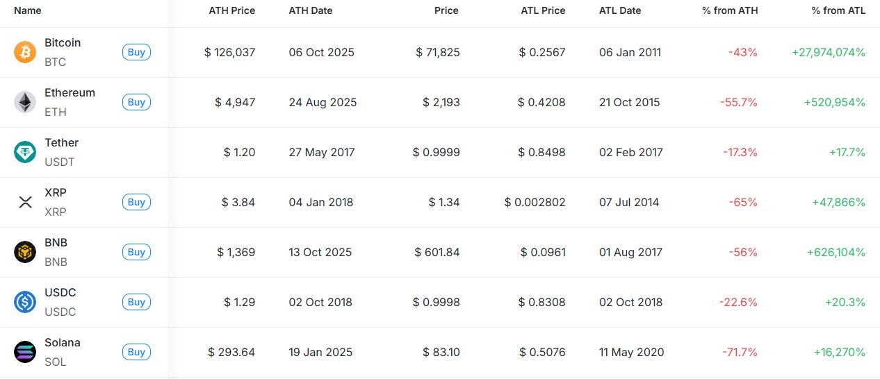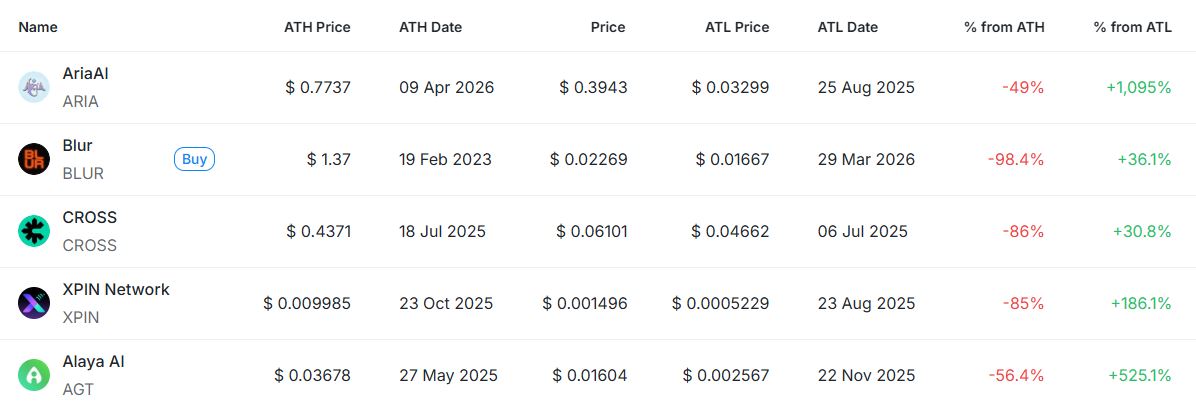[편집자주] 암호화폐 시장은 하루 새 고점과 저점이 빠르게 바뀌는 고변동성 환경이다. 역대 최고가(ATH)와 역대 최저가(ATL) 경신 종목을 추적하면 강세와 약세 흐름을 조기에 포착할 수 있다. 크립토랭크 기준 시가총액 1000만 달러 이상 종목 중 하루 사이 고점 또는 저점을 경신한 주요 토큰을 정리하고 시가총액 상위 종목과 실시간 국내 인기 자산의 고점 대비 조정률을 함께 분석해 시장 회복 여력과 흐름을 진단한다.