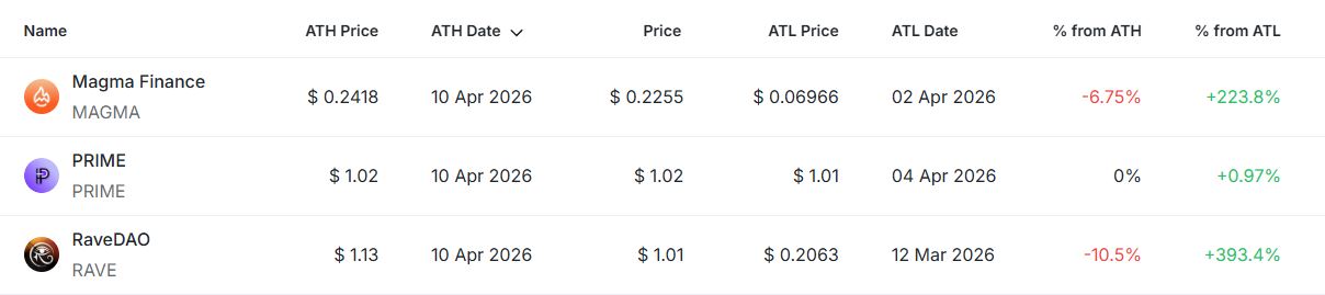 이번 신고점 종목들은 전반적으로 최근 고점 형성 이후 단기 조정을 거치는 흐름을 보였다. PRIME은 ATH와 동일한 가격을 유지하며 강한 가격 방어력을 나타낸 반면, MAGMA와 RAVE는 고점 대비 소폭 하락하며 숨 고르기 구간에 진입했다.