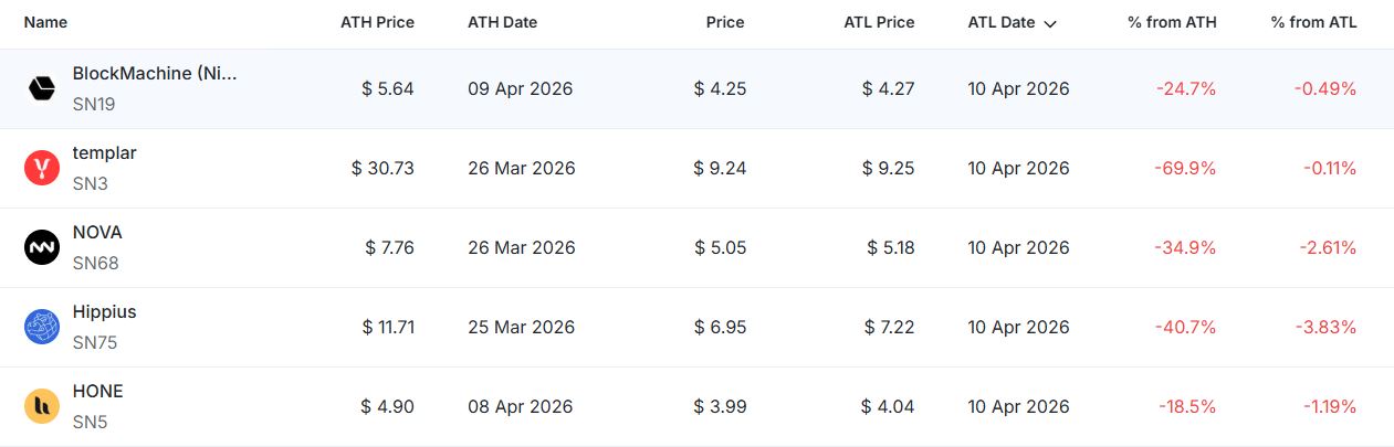 이 외에도 ▲아이오타(SN9) ▲엔이그마(SN63) ▲타르곤(SN4) ▲데이터 유니버스(SN13) ▲스코어(SN44) ▲SOON(SOON) ▲그레일(SN81) ▲콜딘트(SN29) ▲에이펙스(SN1) ▲드리프트 프로토콜(DRIFT) ▲리지스 AI(SN62) ▲월드 리버티(WLFI) ▲반타(SN8) ▲어파인(SN120) ▲베이스드(BASED) 전체 20개 종목이 신저점을 경신했다. 이번 신저점 종목들은 전반적으로 최근 고점 이후 빠르게 가격이 밀리며 단기 하락 압력이 지속된 특징을 보였다. 다수 종목이 ATL 인근에서 거래되며 유동성 축소와 매도 우위 흐름이 동시에 나타났다.